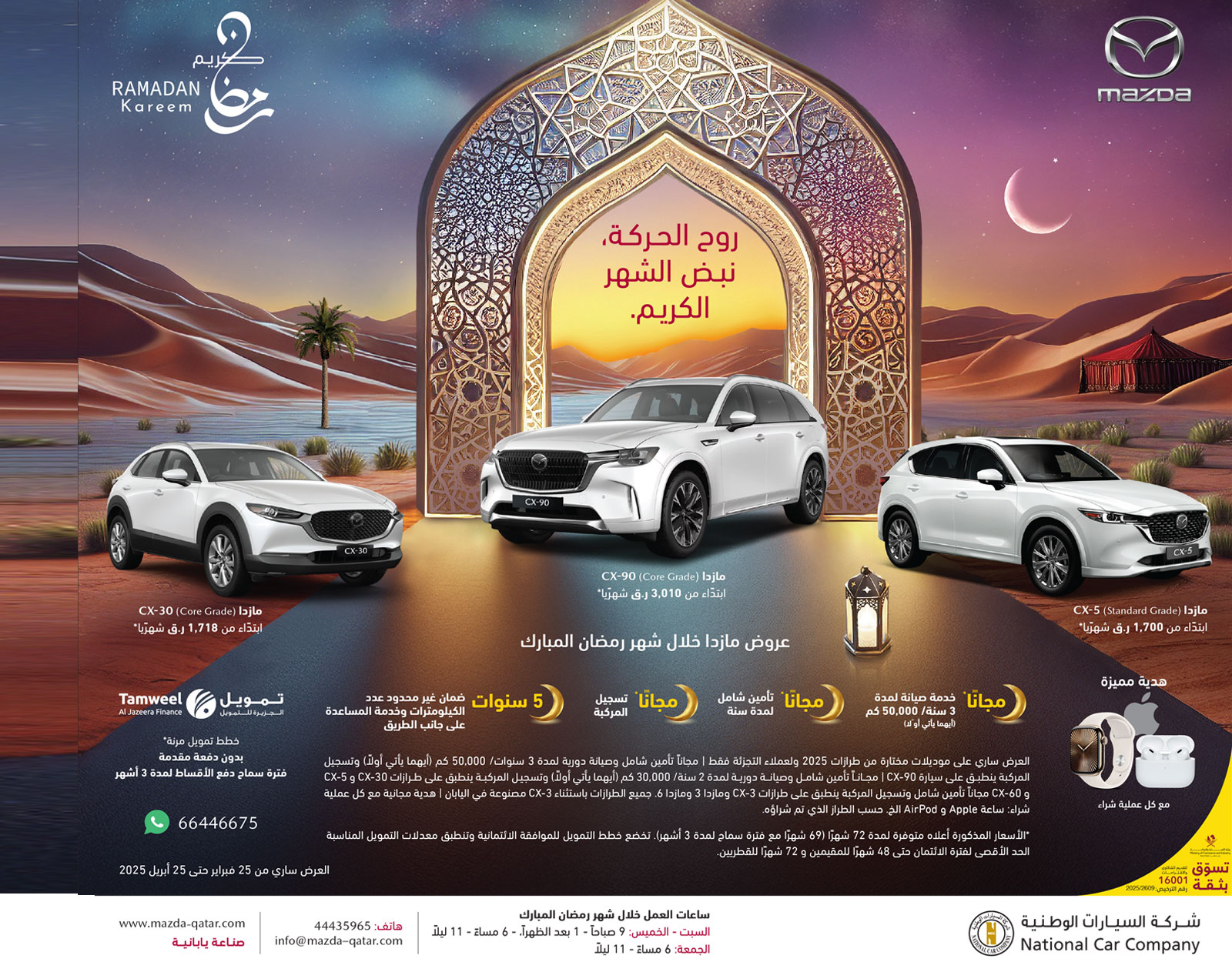 في شركة السيارات الوطنية (مازدا قطر) ، نهدف إلى توفير قيمة استثنائية لعملائنا الكرام على مشترياتهم ، ونحن نحقق ذلك باستمرار من خلال عروضنا الخاصة.